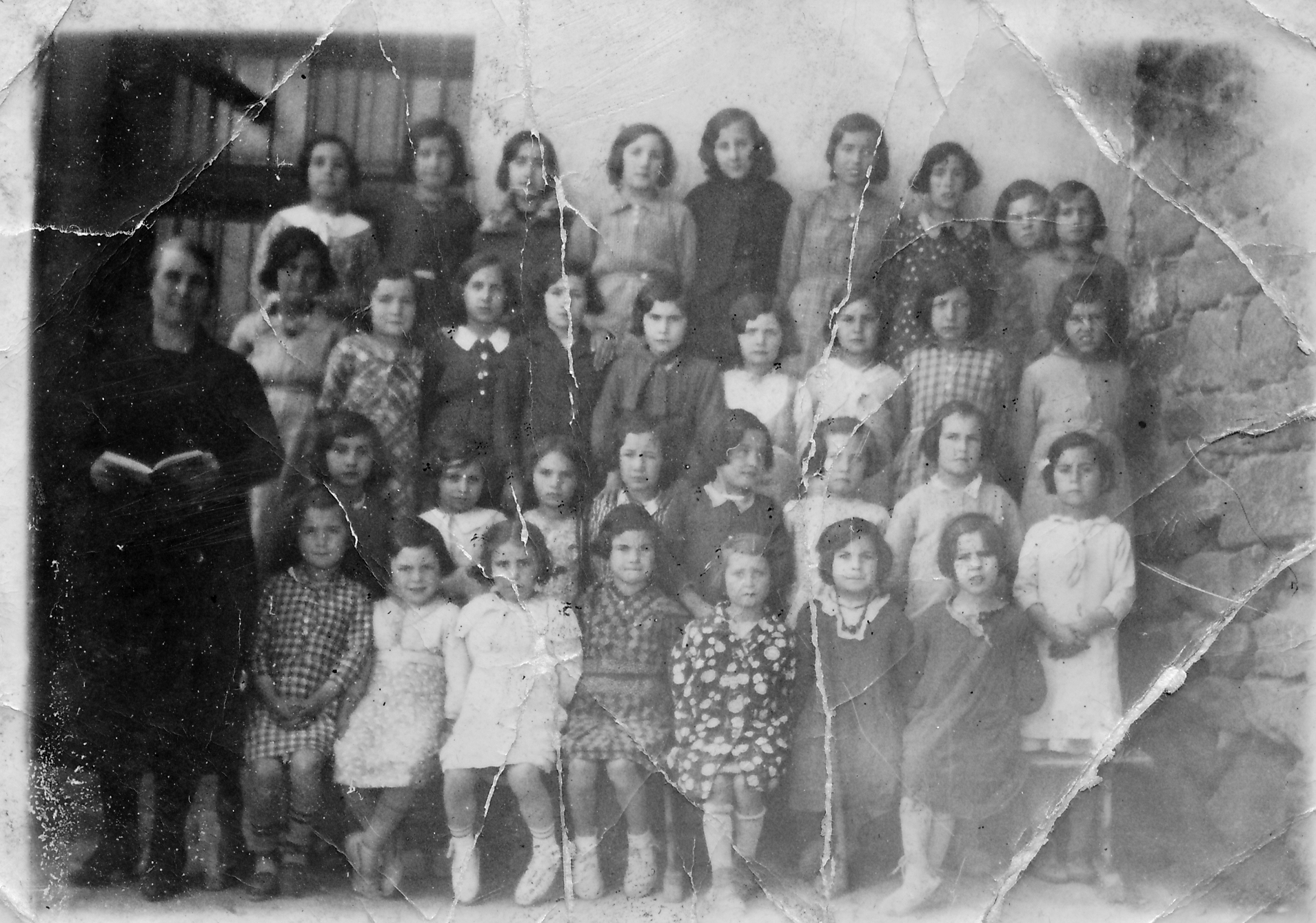 Datos de la Imagen Principal. Orés, 1942. Asunción Pemán Marco en la fachada de las Escuelas con sus alumnas. Foto de Gregorio Romeo Berges. Propiedad de la autora.