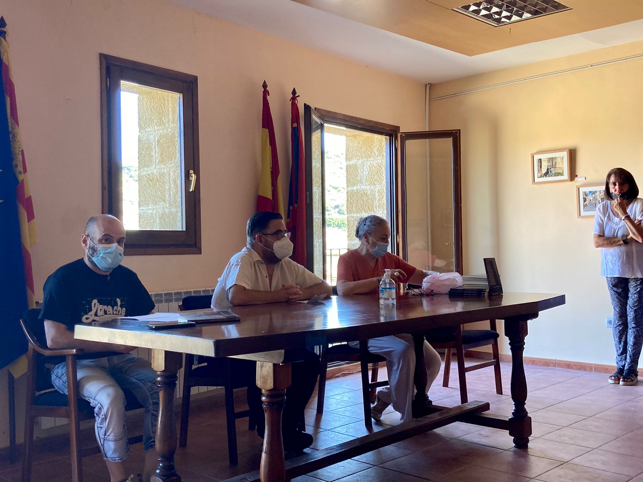 Presentación de Como cada tarde, una novela de Sara Puente, en el Salón de Plenos del Ayuntamiento de El Frago. En la mesa, Chesus Asín, José Ramón Reyes, alcalde, y Sara Puente. De pie, Inés Laplaza, que cantó las jotas del texto de la novela. El Frago, 21 de agosto de 2021, a las 11,30h.