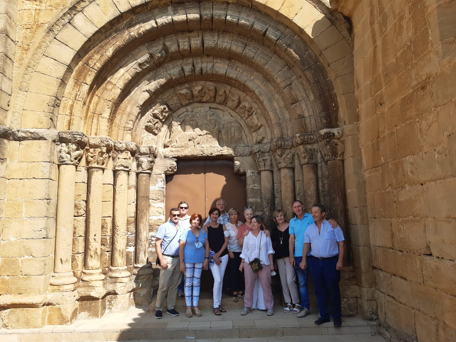Sara con sus amigos de Zuera en la puerta mayor de la iglesia de San Nicolás de Bari de El Frago.