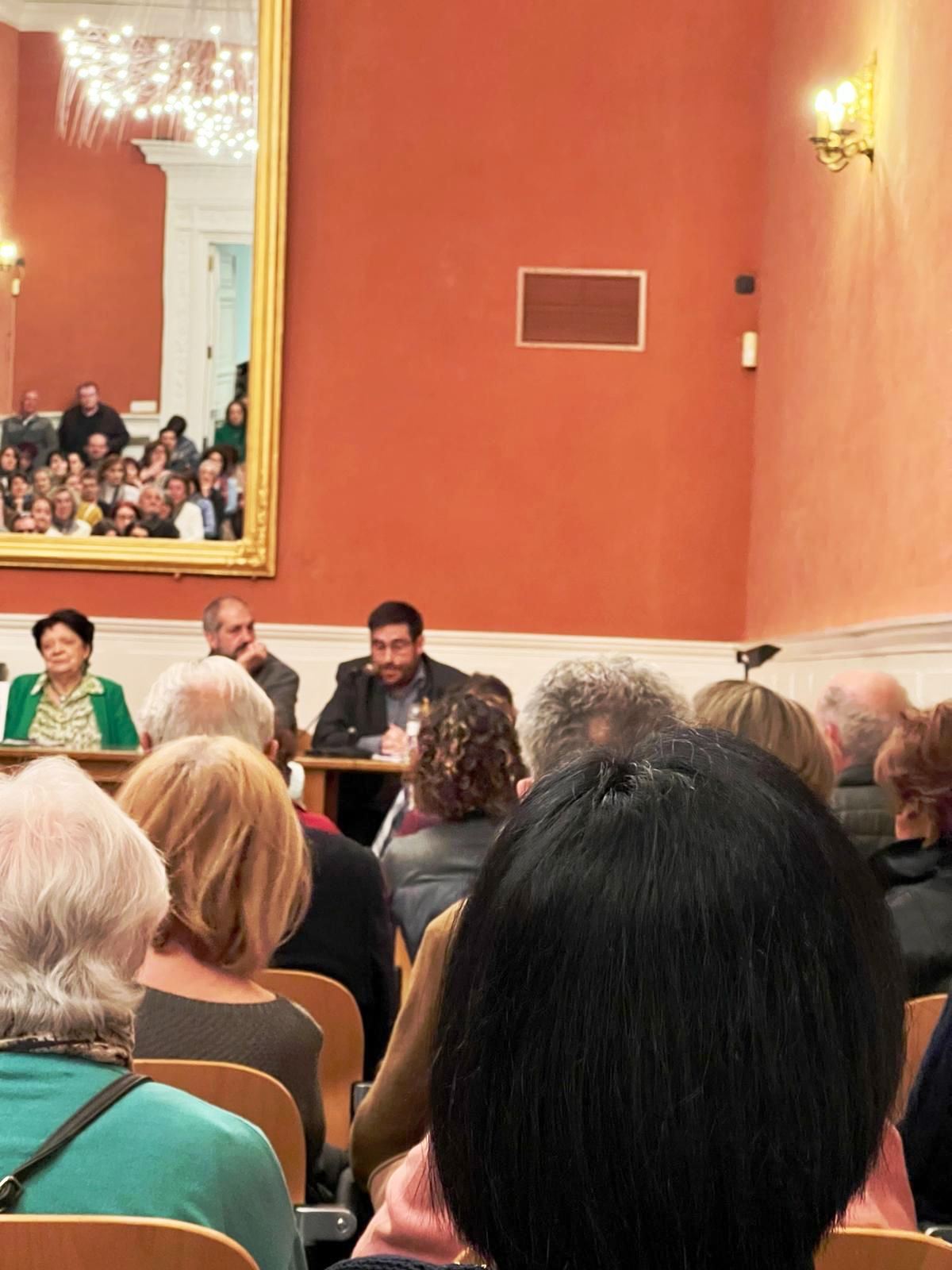 Ahora paso a la mesa. En primer lugar gracias a José Manuel Latorre, diputado provincial de Archivos y Bibliotecas, por la Chunta Aragonesista. Me consta la buena disposición del señor Latorre para acoger este acto desde el primer momento. Para mí es un honor presentar mi obra en esta casa y en este salón de la música. Un lujo. También es un orgullo, saber que el señor Latorre comenzó a amar las lecturas en la Almunia, de la mano de mi querido primo José María Pemán Martínez. Un enseñante de raza donde los haya.
