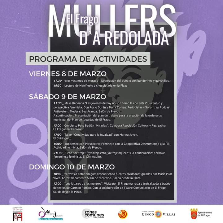 El próximo domingo, día 10 de marzo, en El Frago, como cierre a un programa de actos en torno al 8M, las mujeres del pueblo leerán y teatralizarán alguno de mis relatos de la serie, «Las fragolinas de mis ayeres». Al final os dejo el programa.