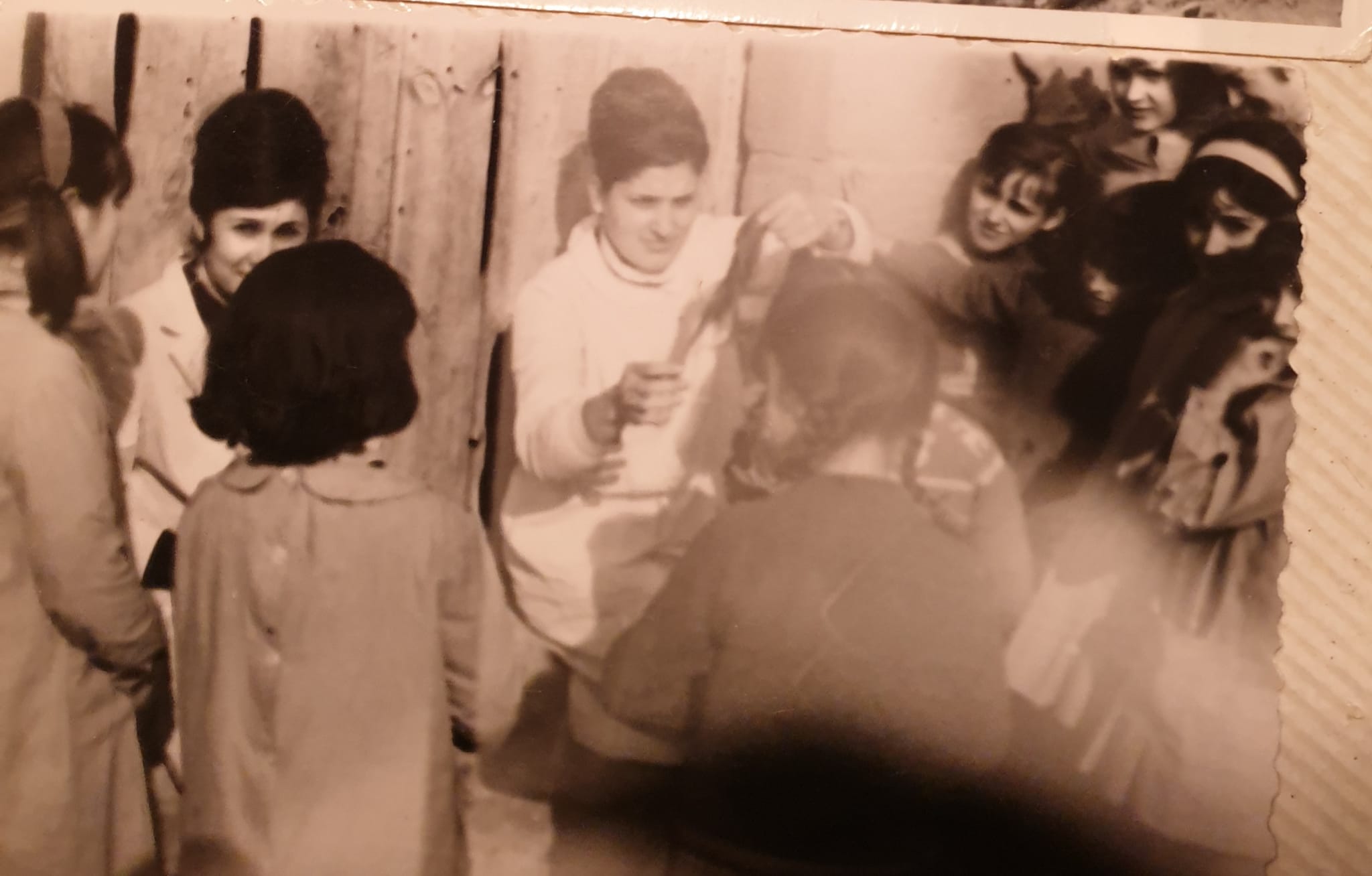 Biel. Teresa Alejandre y Pili Muro peinando a las niñas en la escuela para la Confirmación